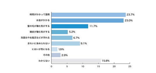 本質問の回答で最も多かったのが、「時間がかかって面倒くさい」の23.7%。次は僅差で「お金がかかる」の23%、そして3番目は「髪が傷む気がする」の11.7%でした。白髪ケアはやらなければいけないこと、だからこそ悩みも尽きないのかもしれません。