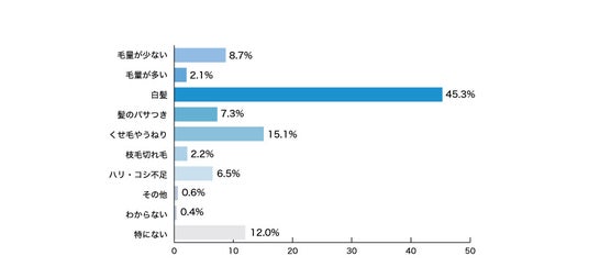 本質問の回答で最も多かったのは「白髪」で、何と45.3%もの方が選んでいます。次に、くせ毛やうねりの15.1%、3番目は毛量が少ないが8.7%。圧倒的に白髪悩みが多いことが解ります。