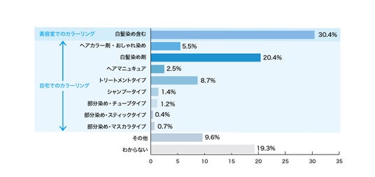 本質問への回答では、「わからない」という方19.3%と、「その他(無回答)」を選んだ方9.6%を除く71.1%の方の中で、美容室のカラーリング(白髪染めを含む)が30.4%、残りの40.7%の方は方法は様々ですが、自宅で白髪ケアをされていることが解ります。その方法として最も多かったのが、白髪染め剤を使用した白髪ケア20.4%で、次にトリートメントタイプのヘアカラー剤を使用した白髪ケアの方が8.7%でした。