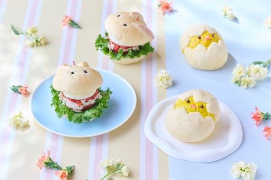うさぎの表情が印象的なバンズで、サラダチキンと目玉焼き、レタスやトマトなど、たっぷりの具材をサンドしました。春のピクニックにぴったりな、ボリューム満点のバーガーです。