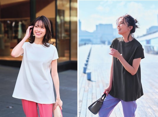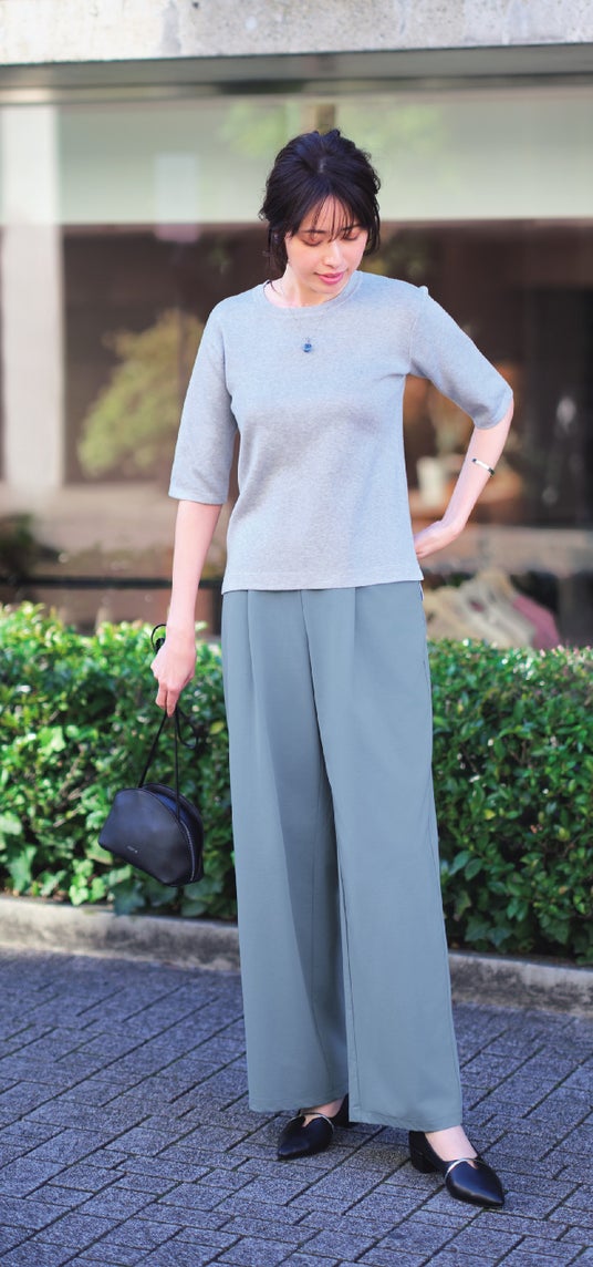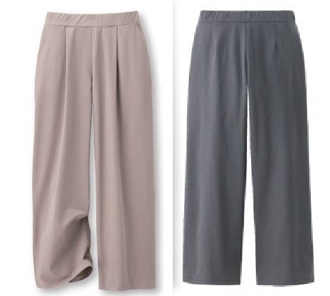 ボトムスは、36ゲージ※2のスーパーハイゲージのカットソー素材で、軽くてラクな着心地とカットソーに見えない着映え感の両立を実現。絶妙な落ち感がありつつ表面は織物のような見え方でキレイ、裏は綿で肌に心地よくなじむこだわりの詰まった仕様です。腰回りをカバーするタック入り、脚線を拾わないほどよいワイドシルエットに仕立てました。