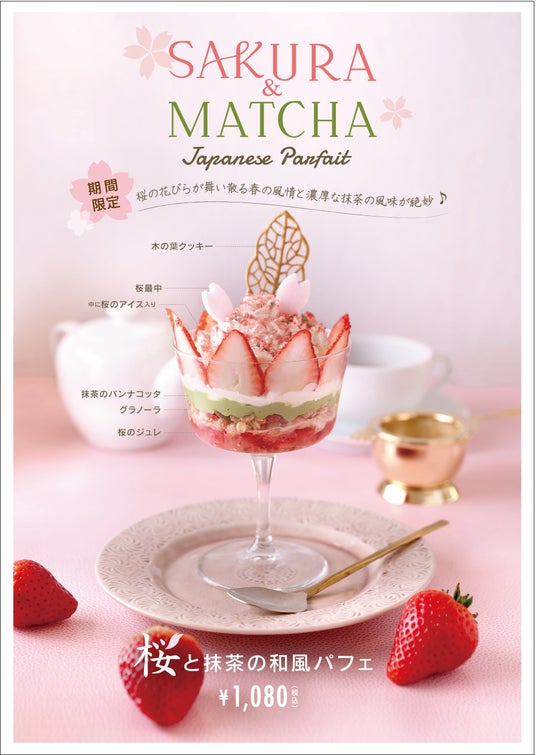TO THE HERBSの新作『桜と苺、抹茶のパフェ』 桜の花びらが舞い散る 抹茶の風味が絶妙な春限定パフェ♪