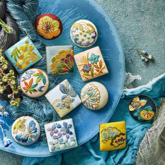 クチュリエでは手づくりの楽しさをすべての人へ体験してもらえるよう、さまざまな技法のキットを続々と発売しています。春の新作では、伝統の文様を絹糸を使った刺しゅうで楽しめるキットがおすすめです。四季折々の花や草木を光沢のある絹糸で刺しゅうしてミニブローチに仕立てます。手軽にトライできて身につけて楽しめるのもうれしいアイテムです。