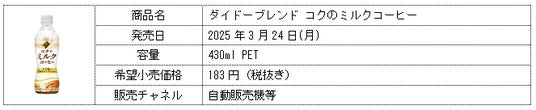 ダイドードリンコ株式会社(本社:大阪市北区、代表取締役社長:中島 孝徳)は、2025年春夏の新商品として、「ダイドーブレンド コクのミルクコーヒー」を3月24日(月)より発売いたします。
