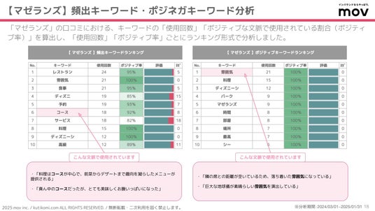こちらの表では、「マゼランズ」の口コミにおける、キーワードの「使用回数」「ポジティブな文脈で使用されている割合(ポジティブ率)」を算出し、「使用回数」「ポジティブ率」ごとにランキング形式で分析しています。
