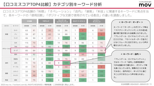 こちらの表では、口コミスコアTOP4店舗の「料理」「オペレーション」「店内」「接客」「料金」に関連するキーワードに焦点を当て、各キーワードの「使用回数」「ポジティブな文脈で使用されている割合」の違いを調査しています。