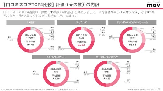 こちらのグラフでは、口コミスコアTOP4店舗の「評価(★の数)の内訳」を算出しています。平均評価が高い「マゼランズ」では★5が73.7%と、他3店舗よりも大きい割合を占めています。