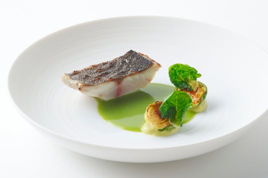 イサキ ハーブソース春が旬の日本の高級魚「イサキ」を5日間熟成させ、旨味を凝縮し、身の質感を引き立てました。炭火と藁で丁寧に焼き上げ、ほのかなスモーキーな香りを加えています。味わいをさらに深めるために、イタリアンパセリとニラを使用した鮮やかなハーブソースを添え、芳醇で香り高い味わいを実現しました。付け合わせには、滑らかな春キャベツのピュレ、香ばしく焼いた芽キャベツ、サクサクの芽キャベツチップスを添え、食感と味の奥行きを楽しめるように仕上げました。