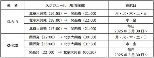 関西エアポート株式会社は、2025年3月20日(木)より中国聯合航空(KN)が関西=北京大興線を新規就航することをお知らせいたします。