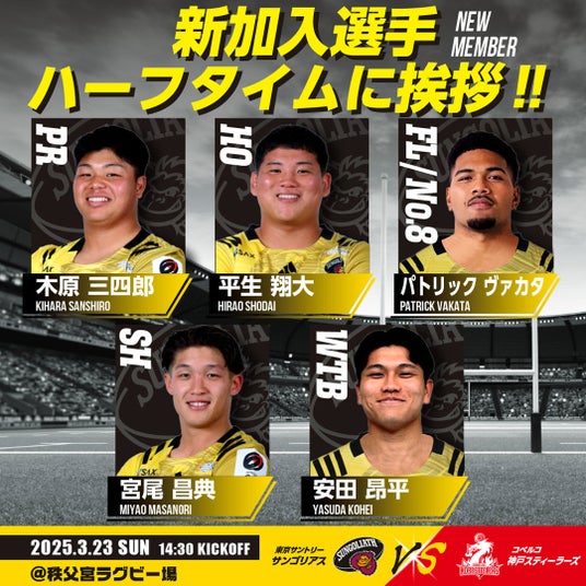 3月23日(日)のサンゴリアスホストゲームでは、新加入選手5名によるご挨拶をハーフタイム中に実施します。