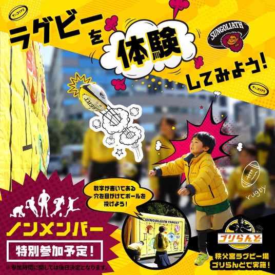 ゴリらんどにラグビー体験ができるコーナーを設置。当日はオフメンバー参加のイベントも計画中です。ぜひ体験してみてください。※雨天・荒天時は中止の可能性があります。