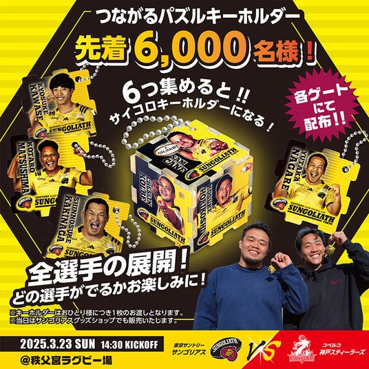 各チケットゲート入場時に、お一人様につき1枚をランダムでプレゼント。6枚集めるとサイコロキーホルダーも作れます(当日はサンゴリアスグッズショップでも販売)。先着6,000名様限定。お早めにご来場ください。