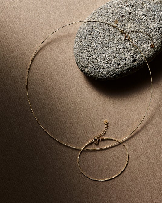 柔軟性のある形状記憶のワイヤーに2種類のカットビーズを隙間なく通した、ネックレス・ブレスレット。ひねりを加えてもハリのある円形をキープします。とても軽い素材のため、ストレスフリーな着け心地が魅力。細くしなやかなラインが繊細にきらめきます。