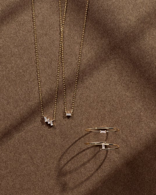 バゲットカットのダイヤモンドが際立つよう、最小限の石枠で仕上げたネックレスとリング。スクエア型の面がきらっと輝き、凛とした大人の表情を演出。日常遣いとして気負うことなく着用できます。