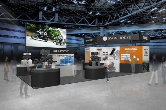 バイク用インカム「B+COM」シリーズのお試しができる試聴コーナーや、バイク専用デバイスホルダー「MOUNT SYSTEM」を実際に取り付けた車両展示、取り付け車両を撮影したパネル展示を行います。