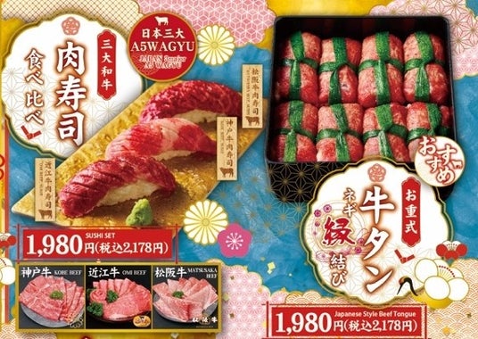 日本三大和牛である「神戸牛・松阪牛・近江牛」肉寿司の食べ比べと牛タン縁結びが限定商品となっております。