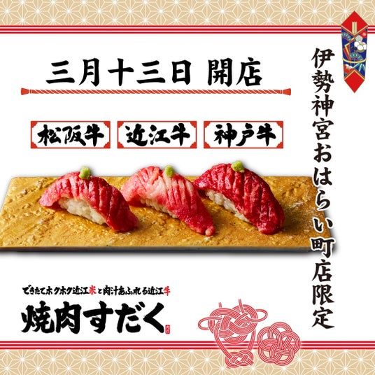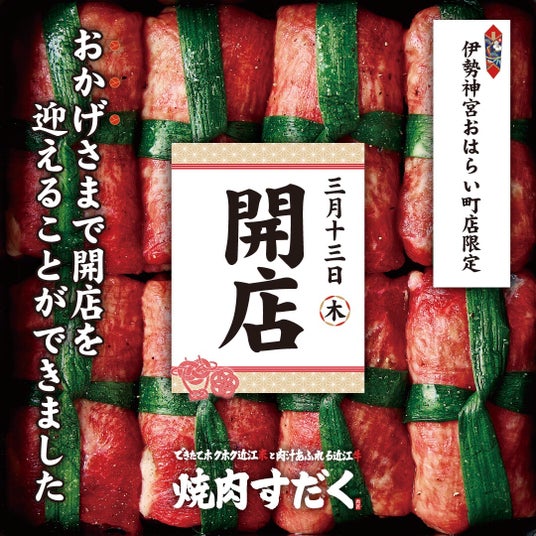 株式会社総合近江牛商社(本社:滋賀県守山市/代表取締役社長:西野 立寛)が運営する『焼肉ホルモンすだく』は、2025年3月13日(木)にフランチャイズ店として『焼肉すだく伊勢神宮おはらい町店』(三重県伊勢市)をグランドオープンいたしました。また、伊勢神宮おはらい町店限定のメニューも登場いたします。