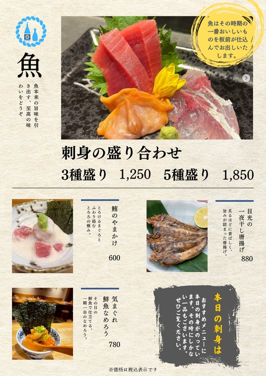 各料理と日本酒は、その日最も良い状態のものを厳選して提供いたします。