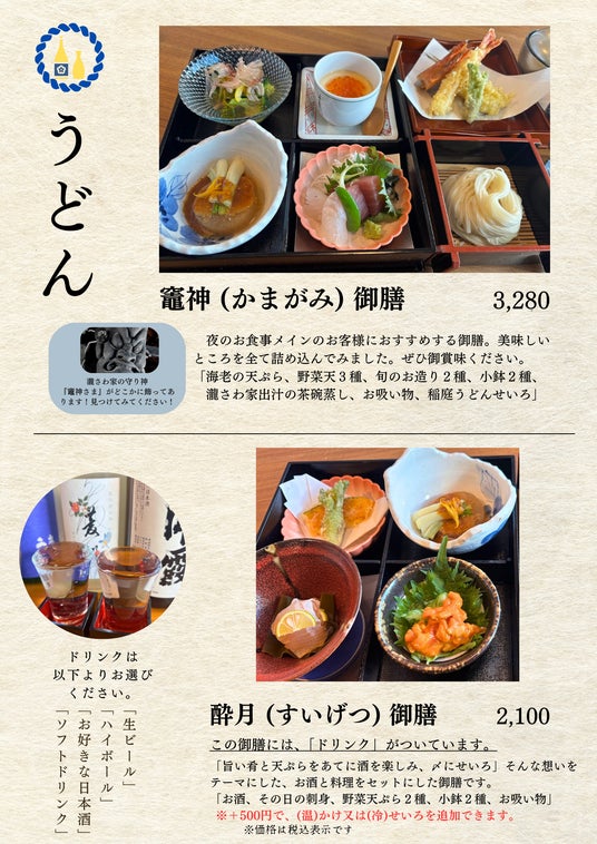 また、お酒を楽しむ方も、稲庭うどんを味わいたい方も満足できるメニューを用意。