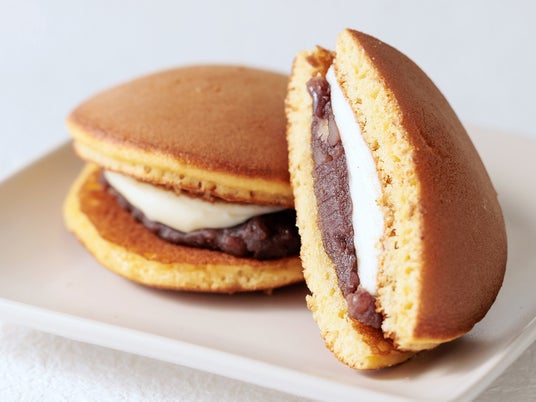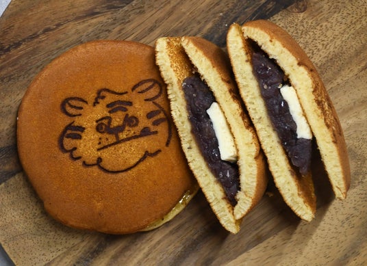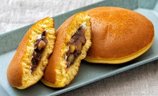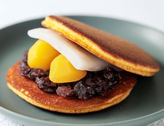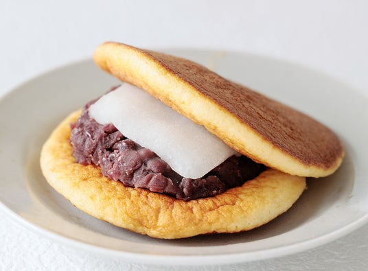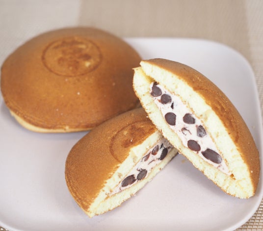 しっとりと甘い生地の中に粒あんと求肥餅を挟み込んだどら焼きです。