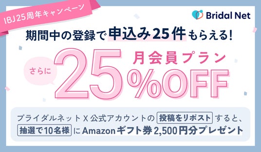 ブライダルネットでは、IBJ25周年を記念し、「25」にちなんだ特別キャンペーンを開催。入会特典や月会費プランの割引に加え、SNSでのプレゼントキャンペーンを実施します。