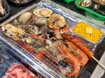 そのほかサザエ、ホタテ、アワビ、ホッキ貝、ホンビノス貝、エビ、タコ串、イカ串などの浜焼きや牡蠣フライ(3個)、牡蠣ごはん、牡蠣汁、牛串、豚串、フランクフルト、フライドポテト、コーンバター(330円~)などのフードやおつまみ、ソフトドリンク(330円)アルコール)(550円~)もご用意