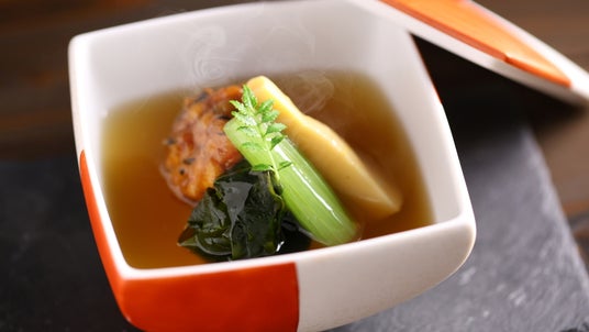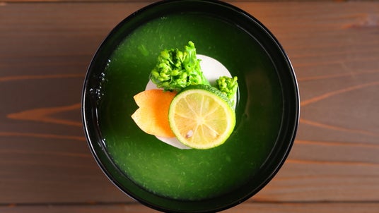 ※香り 北海道の羅臼産昆布を使った蛤の貝出汁と昆布の旨味、菜花の香りが効いた料理長自慢のお出汁でございます。 蛤真丈や菜花を合わせて、春らしさを加えております。