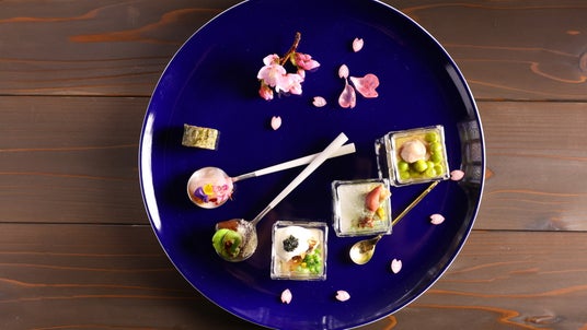 ※旬菜 『わ・マテリエル・キュイジーヌ』でございます。フランス語で原料や材料を意味しております。 盛り付けには飴細工などで夜の水面に浮かぶ桜を表現しております。