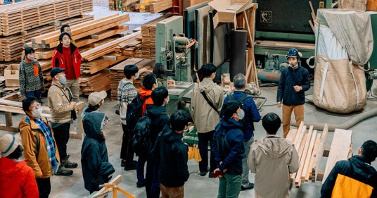 ・地域産の木材を価値化するファクトリーで、薪の製造工程や製材作業を間近で見学
