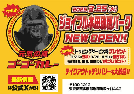 株式会社ゴーゴーカレーグループ(本社:石川県金沢市、CEO兼代表取締役社長:西畑誠、以下 ゴーゴーカレー)は、2025年3月25日(火)に新店舗「ゴーゴーカレージョイフル本田瑞穂パーク」をオープンいたします。場所はジョイフル本田瑞穂店のフードコート内で、ジョイフル本田への出店はこれが2店舗目となります。オープニングキャンペーンとして、オープン当日はお食事いただいた方へ次回ご来店時にご利用できるトッピングサービス券を5枚プレゼントします。3月26日~4月5日の間も、トッピング券を1枚プレゼントします。