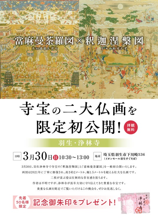 寺院コンサルティングを行う株式会社エータイ(本社:東京都千代田区、代表取締役:樺山玄基、以下「当社」)は2025年3月30日(日)、埼玉県羽生市の浄林寺で仏画公開イベントを行います。当日は、修復後初めての一般公開となる「釈迦涅槃図」「當麻曼荼羅図」を無料で公開し、記念として先着50名様に「切り絵御朱印」を配布いたします。
