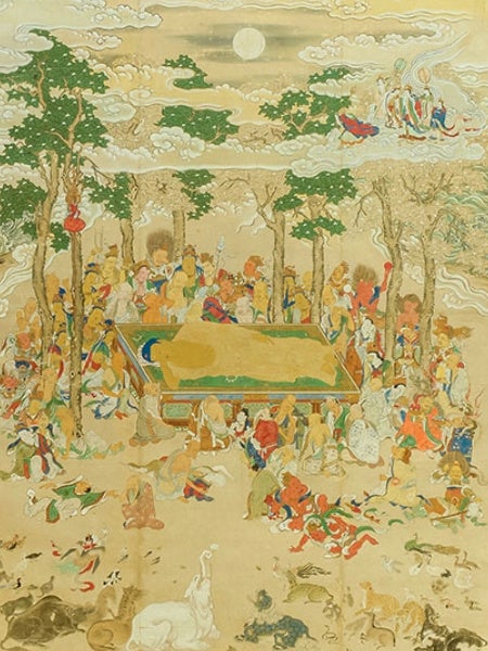 ▼釈迦涅槃図(しゃかねはんず)お釈迦様が亡くなった時の様子を描いたもので、横たわるお釈迦様と、それを悲しむ弟子や動物たちが描かれています。