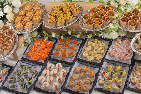 全16種類。〈シーフードピラフ〉〈トリュフソースのグリルチキン〉〈四川風エビのチリソース煮〉をはじめとした温製料理と、〈イタリア風オムレツ〉〈トリュフ風味のライスコロッケ〉〈季節のフィンガーフード〉をはじめとした冷製料理をお楽しみいただける豪華セットです。