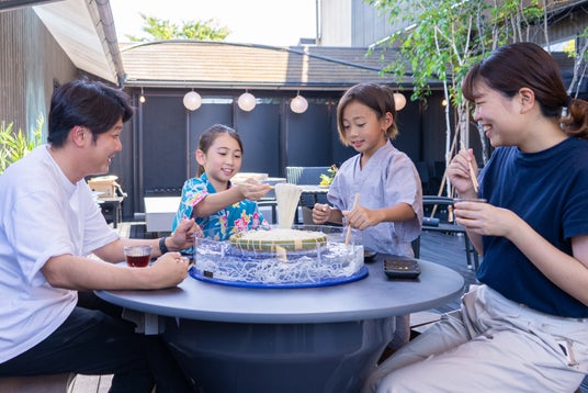 屋外が気持ち良い春先に、回転式の流しそうめんをぜひお楽しみください。