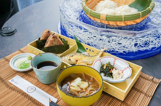 (流しそうめん、季節の焼き魚、寝かせ玄米(R)おにぎり、副菜2種、汁物)
