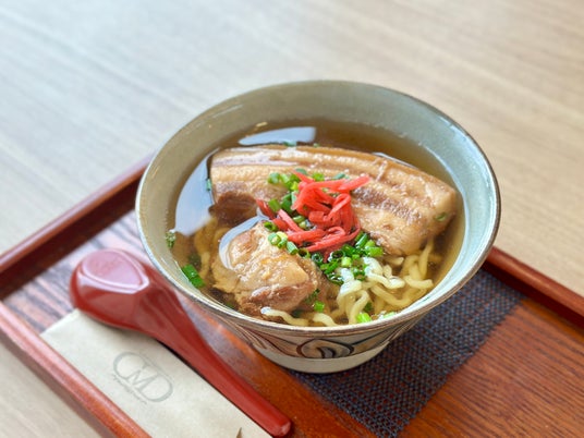 麺はちぢれ麺を採用し、スープとの絡みを大切に。お肉には、今帰仁の黒糖と泡盛を使用し、甘めの味付けに仕上げた三枚肉とソーキがトッピングされています。この組み合わせが絶妙なバランスを生み出し、子どもから大人まで楽しめる沖縄そばとして人気を集めています。