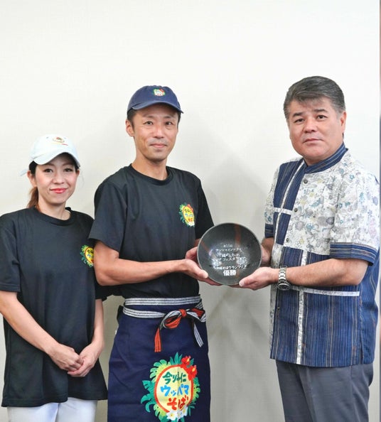 店長リョウ(右)が沖縄めんそーれフェスタで受賞した時の様子