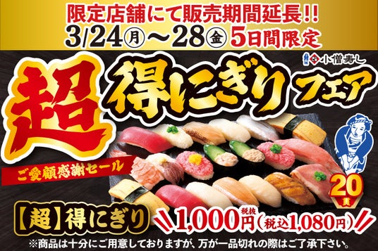 大!大!大好評につき、販売期間延長!小僧寿しの人気企画『【超】得にぎりフェア』3月24日(月)~開催します!(限定店舗にて販売します)