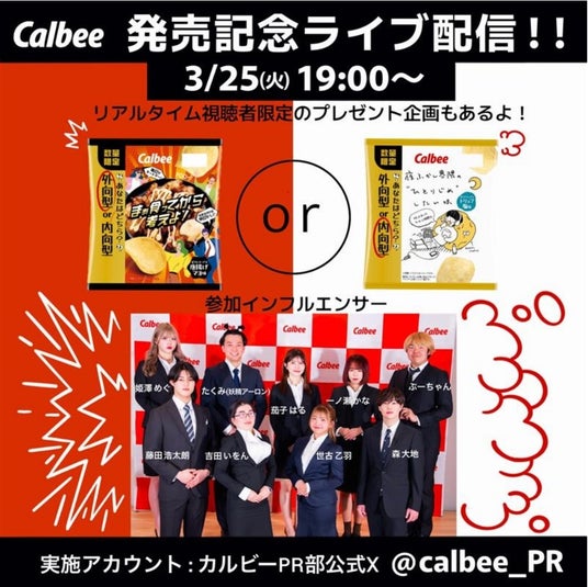 商品発売日にカルビーPR部公式X(@calbee_PR)で、商品開発に参加したインフルエンサーが出演する発売記念ライブを配信します。ライブでは、商品の紹介や開発秘話のトークなどで、商品の発売を盛り上げます。配信中、配信後にはプレゼントキャンペーンも実施予定です。