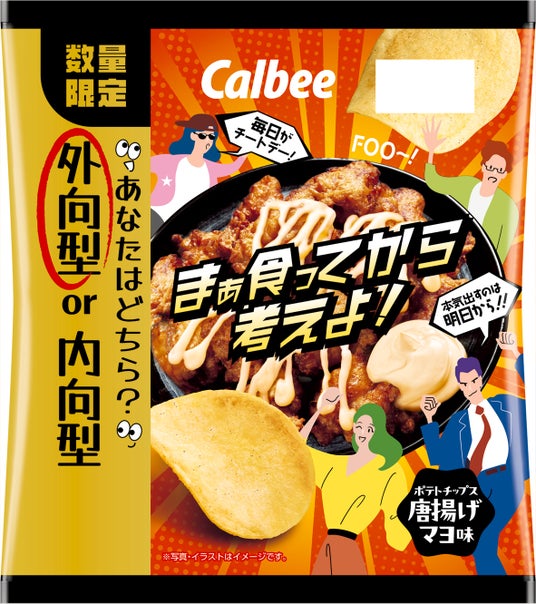 ●「外向型唐揚げマヨ味」は、みんなでワイワイ楽しい時間を過ごすのが好きな外向型の人のためのポテトチップスです。「毎日がチートデー」「まあ食ってから考えよ」などと言い合いながら背徳感のある「唐揚げマヨ味」のポテトチップスをお楽しみいただけます。
