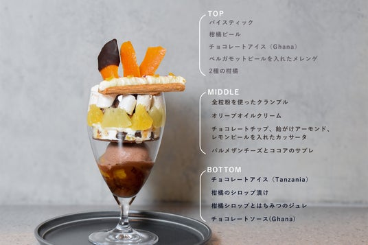 パフェのボトムには、タンザニア産カカオ豆を使ったチョコレートアイスや、柑橘シロップにはちみつをあわせたジュレ、さらにチョコレートソースを用いています。