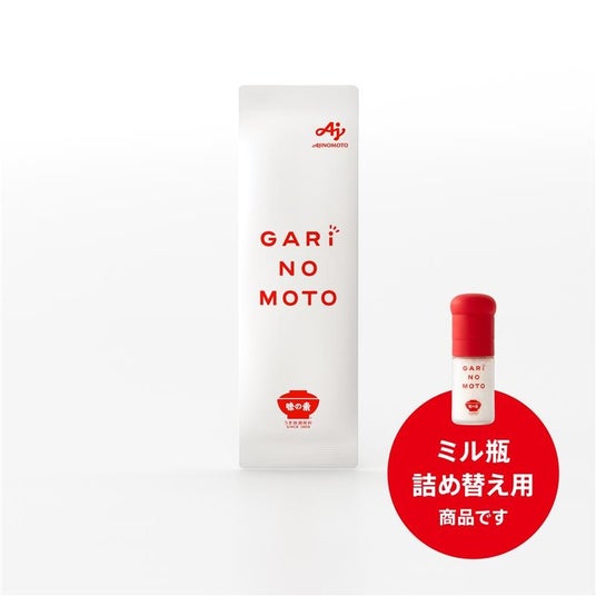 本製品は2024年7月25日(木)にうま味調味料「味の素(R)」発売115周年記念して発売した「GARI NO MOTO(R)」50gミル瓶の詰め替え品種となっております。
