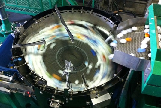 <進栄化成唯一の技術 エコキャップ選別システム。近赤外光センサーで、1分間に1,000個 99.6%の正確さで選別!!>