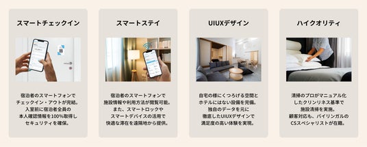 さらに、テクノロジーを活用した民泊運営に強みを持つSmartInnのプロデュースにより、予約やチェックイン、滞在中のサポートやチェックアウトまで、スマホひとつで旅行スタイルに応じた快適な滞在を実現します。