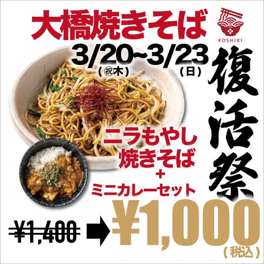福岡・大橋にあるちゃんぽん亭コシキ大橋店(運営:ちゃんぽん亭コシキ)は、2025年3月20日(木)から3月23日(日)の4日間限定で、「焼きそば復活祭」を開催いたします。