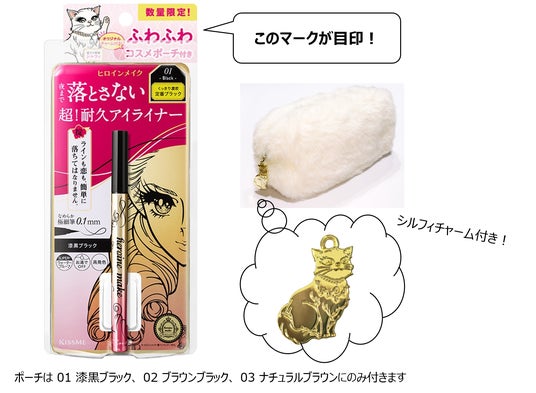 高い耐久性が人気の「ヒロインメイク プライムリキッドアイライナー リッチキープ」と、ブランドアイコン エリザベート・姫子の愛猫 シルフィをイメージしたふわふわポーチがセットに!