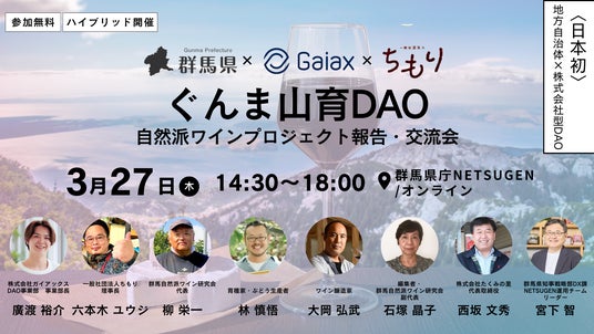 株式会社ガイアックス(東京都千代田区/代表:上田祐司)および群馬県 知事戦略部 デジタルトランスフォーメーション課 NETSUGEN室は、日本初(※)となる株式会社型DAO型を用いた地場ワイン醸造プロジェクト「ぐんま山育 DAO」の発足から1ヶ月、これまでの取り組み報告と今後の計画について、3 月 27 日(木)14 時半より群馬県庁官民共創スペース NETSUGEN にて、関係者のトークセッション並びに報告会を開催します。
