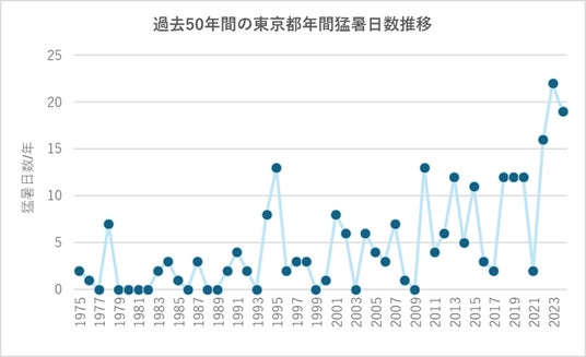 出典:気象庁公表値から作成(猛暑日:日最高気温が35℃以上)/2024年データは6-8月の3か月間の猛暑日、その他の年は通年を適用しました。
