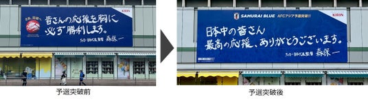 代表選手たちが決意を決めて大きな目標へ前進している中、今回のAFCアジア予選突破で最初の関門となる世界への扉を開くことができました。キリンは森保一監督が抱く日本中のサッカーファミリーと共に世界の舞台で“最高の景色”を見たいという想い、そしてアジア予選突破に向けて一緒に戦ってもらったことへの感謝を、監督の直筆メッセージという形でこの場所を通じて発信することといたしました。そしてサッカーファミリーのみならず多くの方々の心に寄り添いながら、共に最高の景色を目指す仲間を増やしていきたいという願いを込めて、AFCアジア予選突破決定後の興奮をそのままに、一夜にして大型広告を切り替えるというチャレンジをいたしました。