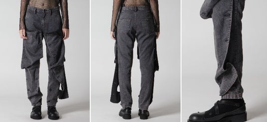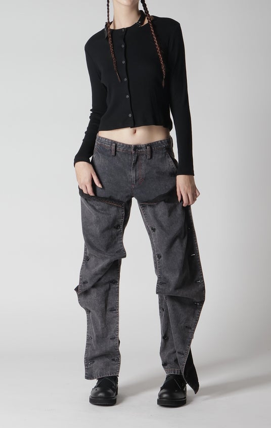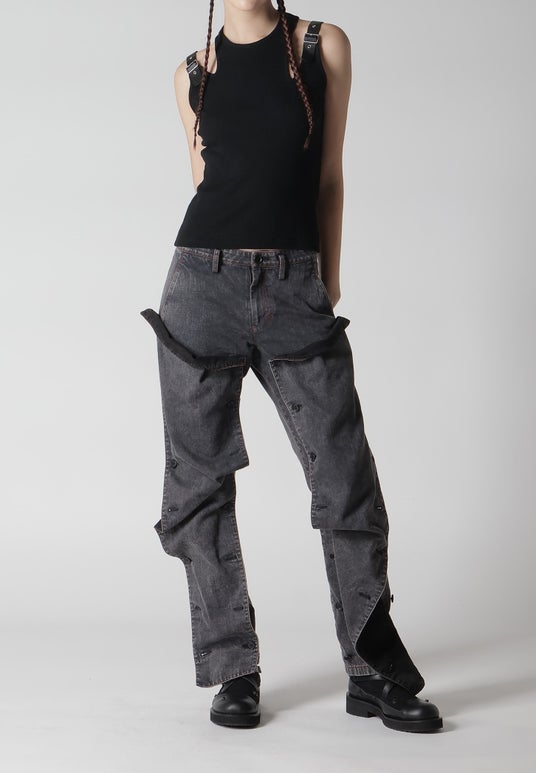 グレーデニムとブラックデニムの組み合わせ、前身頃のデニムカバーのボタンのかけ方によってシルエットが変化、赤ステッチ、後身頃にアウトポケット、製品に特殊な脱色加工を施したヴィンテージ感、コットンデニム